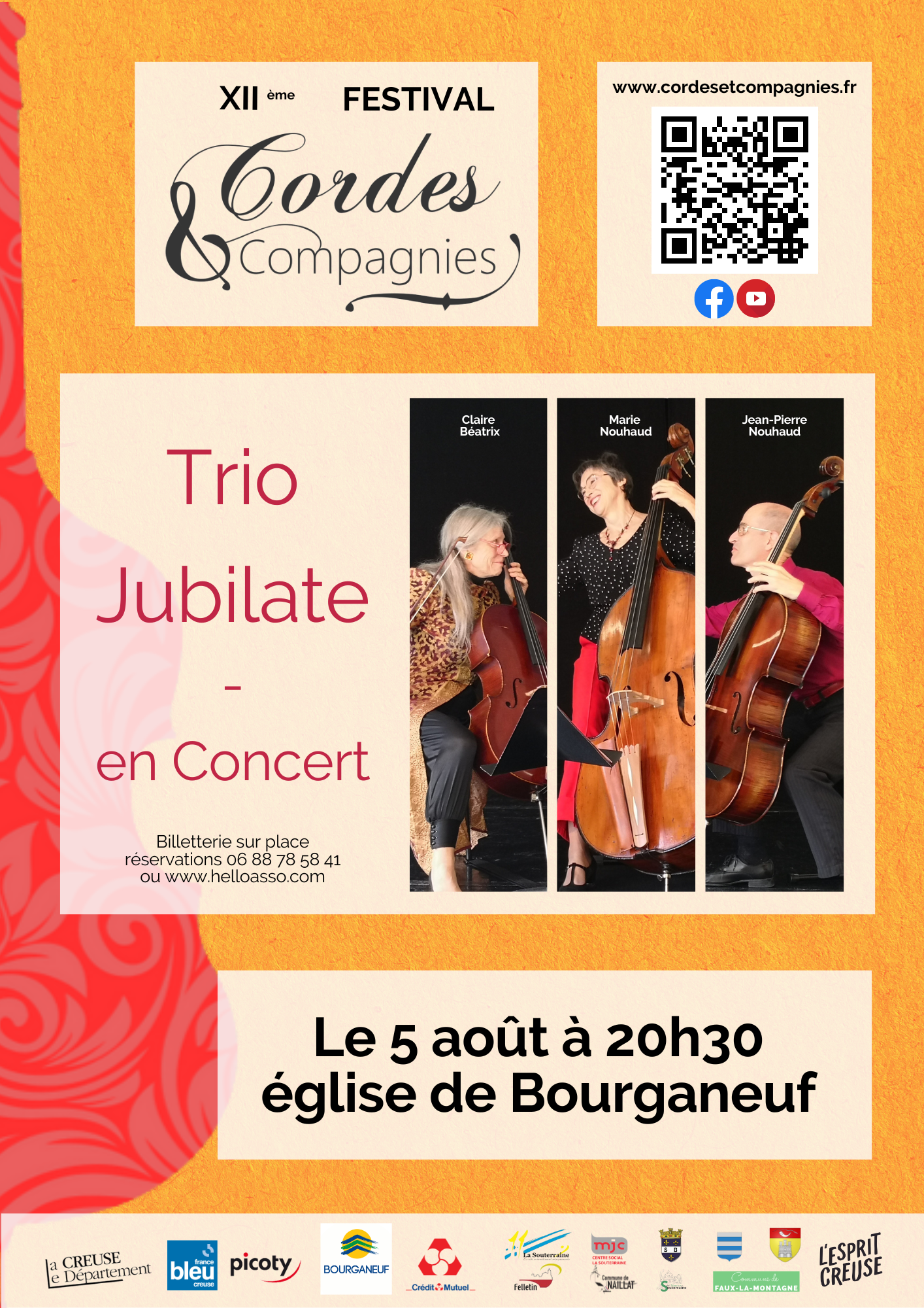 Samedi 5 août 20h30 : Concert classique avec le « Trio Jubilate » (deux violoncelles et contrebasse) par l’association « Cordes et compagnies » à l’église Saint Jean-Baptiste. Billetterie sur place : 15€ plein tarif ; 12€ tarif réduit : demandeurs d’emploi – retraités – étudiants – 12-18 ans. Gratuit pour les moins de 12 ans.